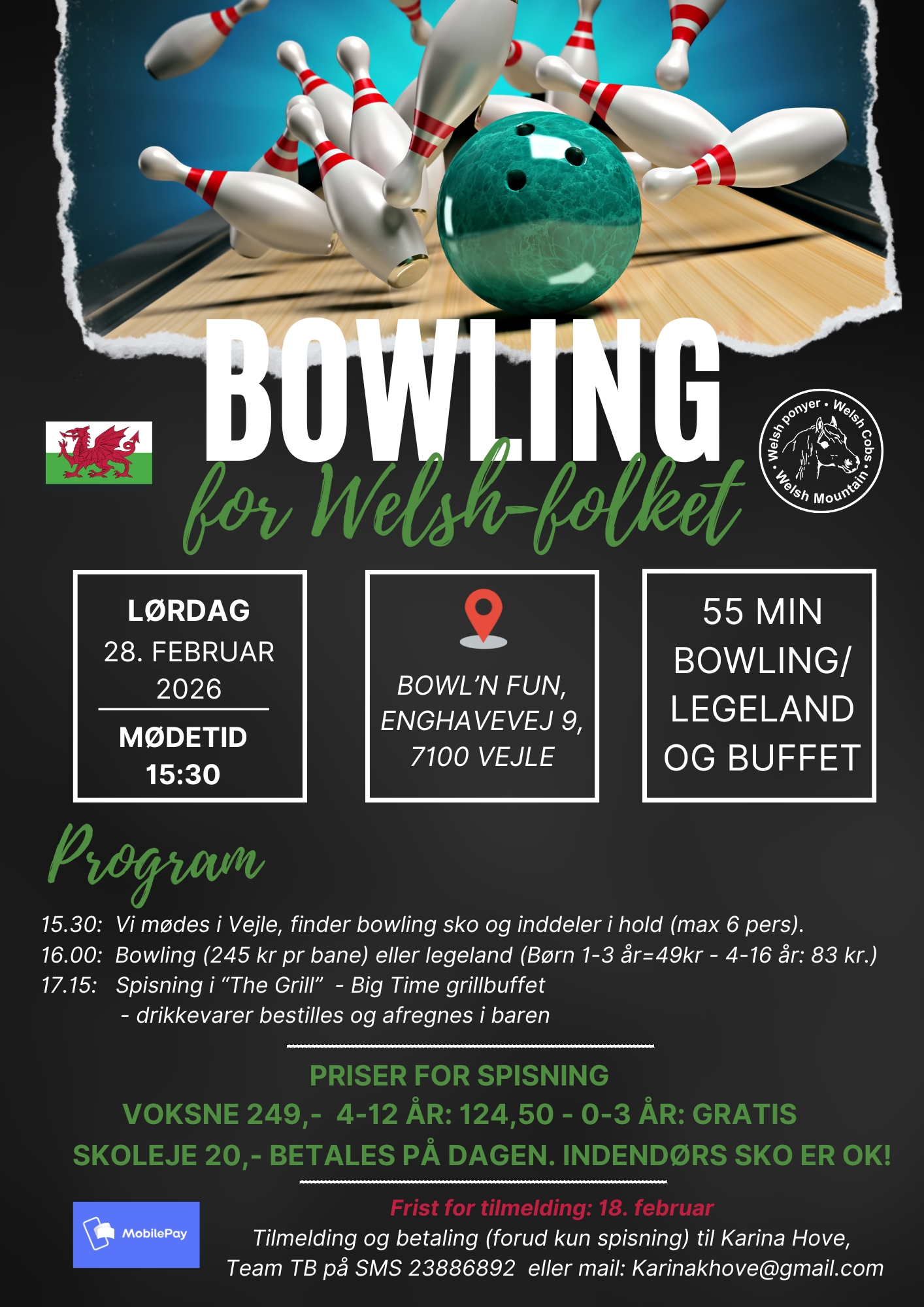 28. februar | ![]() | Tilmelding og betaling til Karina Hove Tilmeldingsfrist 18.2.2026 på sms 23886892 eller mail: karinakhove@gmail.com Betaling mobile pay. |